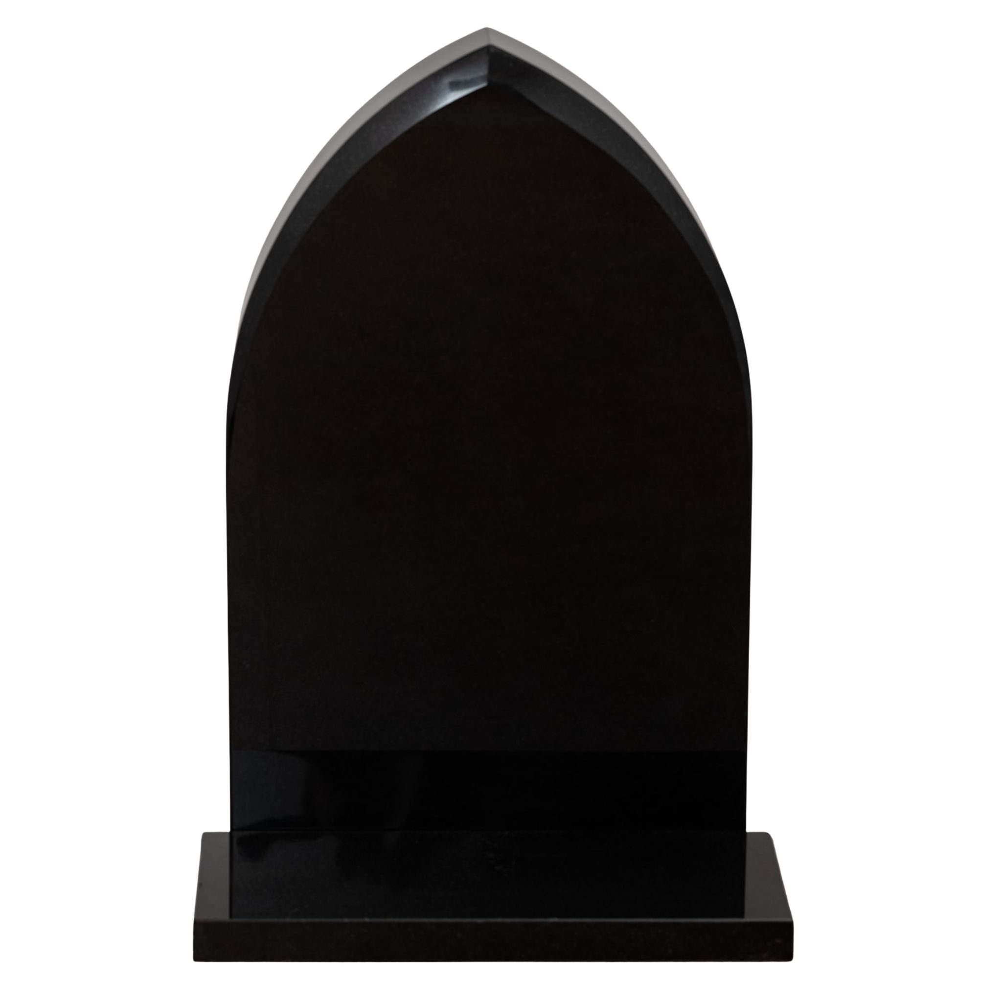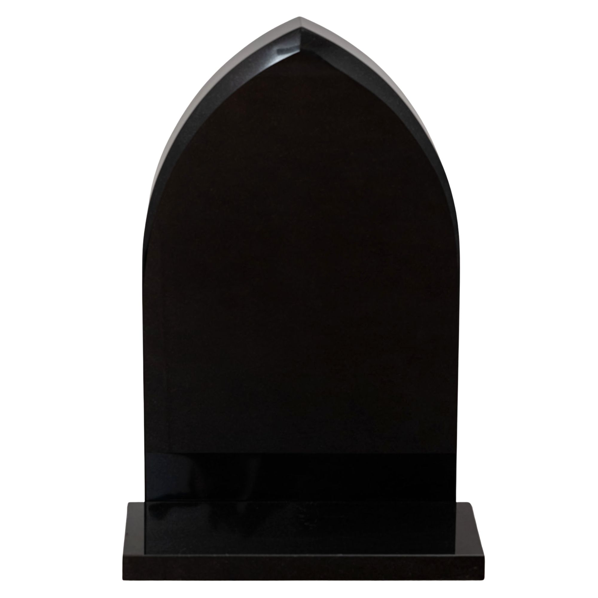 En klassisk gravstein med høy, spiss bue og mørk, elegant overflate. Et tidløst valg for deg som ønsker et stilrent og verdig gravminne.